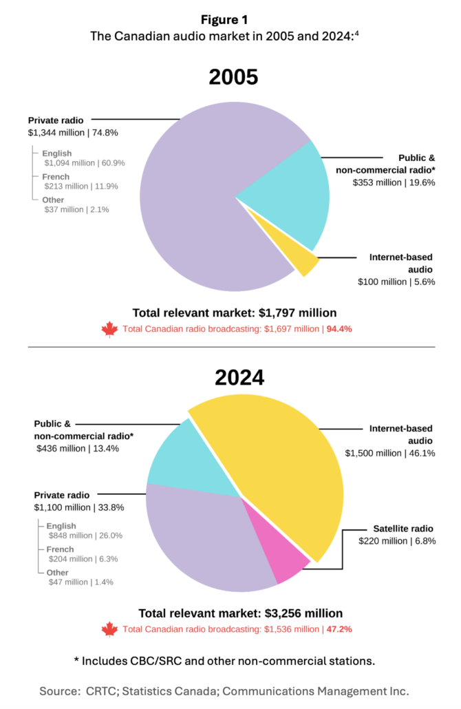 The report, compiled by media consulting firm Communic@tions Management Inc., notes the profound shift in the audio and video space over the last two decades, that’s seen private radio’s share of ear fall from 74.8% in 2005 to 33.8% in 2024. Private television’s share of the TV market fell from 63.1% to 38% over the same period.