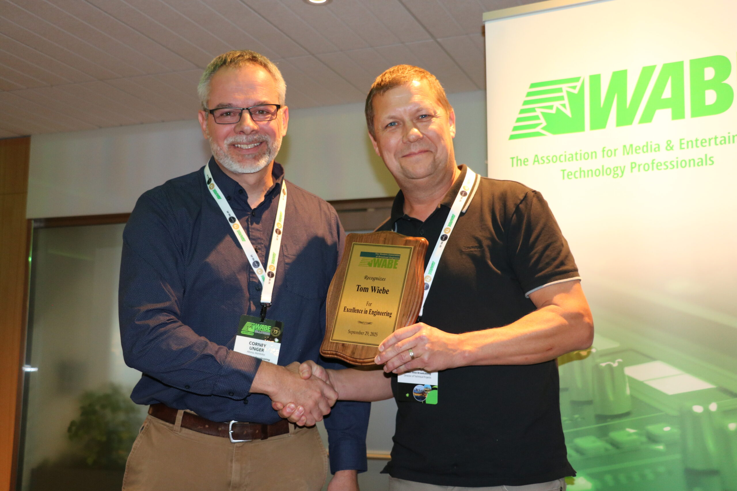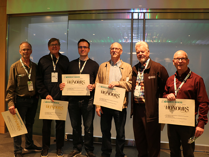 The Western Association of Broadcast Engineers (WABE) kicked off the organization’s 75th anniversary convention in Calgary earlier this week, paying tribute to SAIT BXST (Broadcast Systems Technology) instructors. The program, responsible for training hundreds of broadcast technicians now working across radio, TV, film, and manufacturing, fell to provincial budget cuts in 2020 after celebrating its 50th anniversary in 2019. In an impassioned tribute during Monday evening’s WABE Awards presentation, which was held alongside a SAIT BXST reunion, program graduate and Cisco Senior Solutions Engineer Chris Lapp told the audience that his time at SAIT was the foundation for everything he’s done since. BXST instructors in attendance, including Eugene Blanchard, Jonathan Hutchinson, Karl Grollmuss, Lubos Kuzma, Bill Kilgallon, and Garry Shepherd, were honoured with the R.W. Lamb Award, WABE’s highest honour.