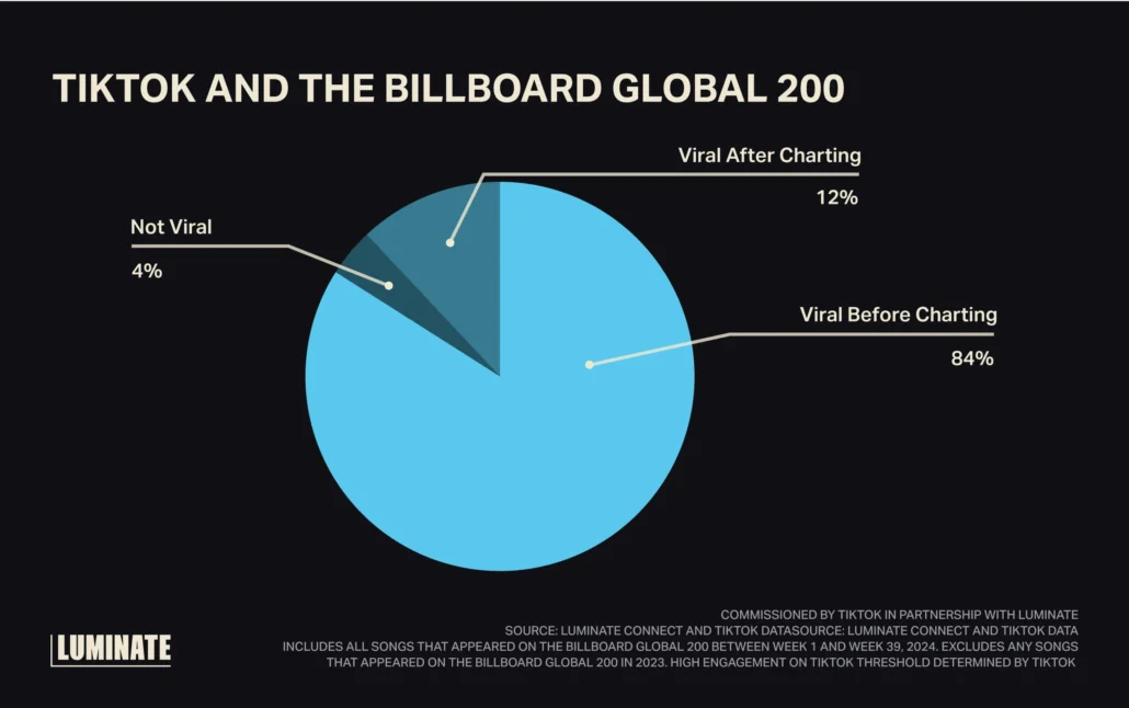 TikTok has enlisted Luminate to understand the relationship between engagement on its platform and an artist’s off-platform music streaming performance, highlighting the short-form video app’s burgeoning impact as a music discovery driver. Using a random sample of almost 700 global artists, Luminate distilled the relationship between the artists’ daily TikTok engagement metrics (Views, Likes and Creations) and their daily on-demand music streaming consumption over the course of three quarters. It also assessed the association between 2024 weekly Billboard Global 200 chart song rankings and the TikTok virality of those songs to uncover potential impact. The findings indicate 84% of songs that entered the Billboard Global 200 in 2024 went viral on TikTok first. Artists whose TikTok engagement is significantly related to their music streaming volumes see an average of 11% weekly streaming growth, compared with just 3% growth among artists whose streaming is less related to TikTok activity. The research also found that TikTok users spend 48% more time streaming music audio than the average U.S. music listener.